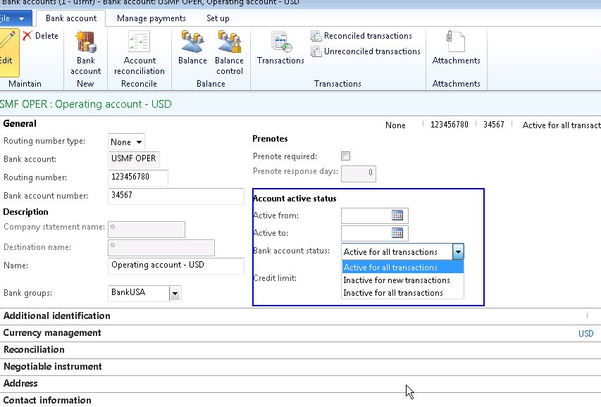 Inactivate for new transactions – Bank account is inactive and no new transactions are allowed.