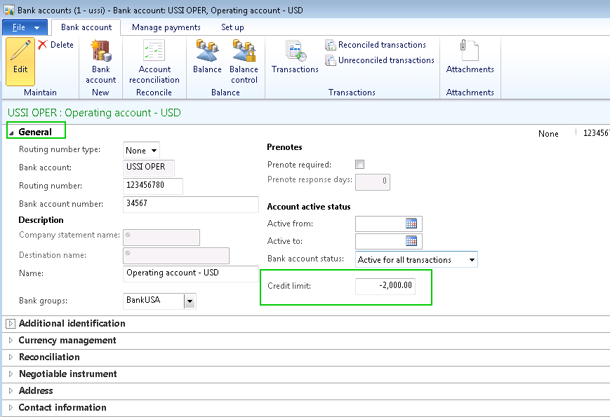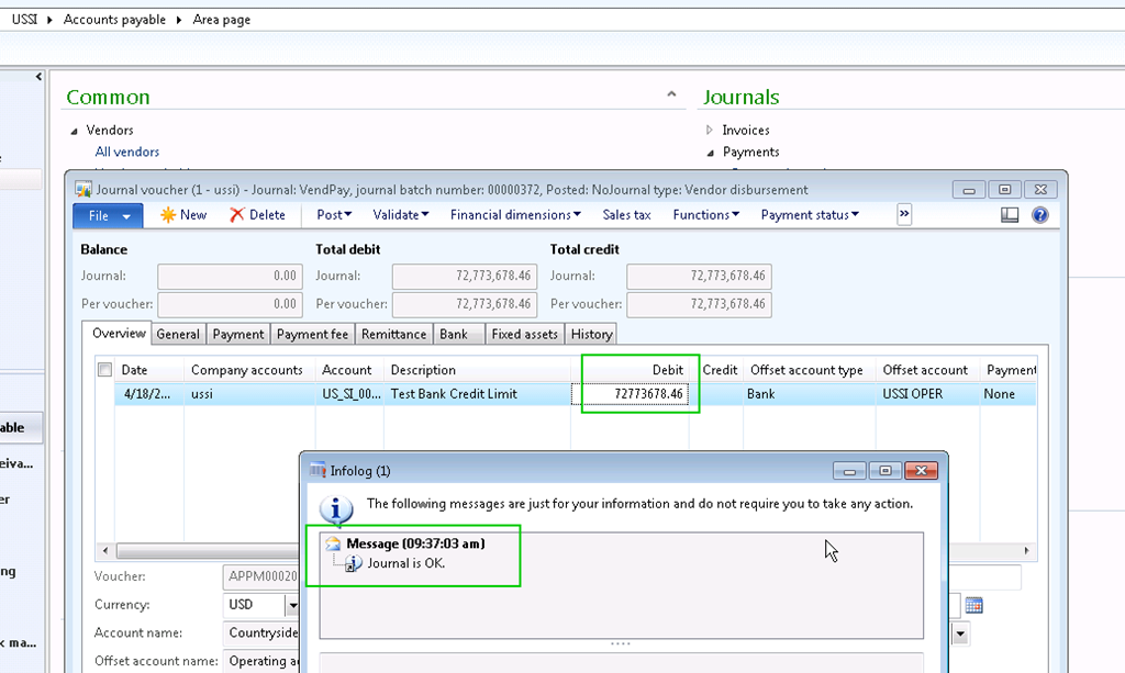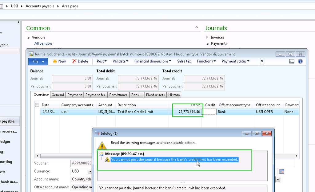 - Note that the available balance in the USSI OPER bank(CONTOSO demo data) is $72771678.46. We will now record a vendor payment journal with an amount $7277378.46(Bank balance + Credit Limit) and validate the journal. System will successfully validate the journal and say It is Ok.
