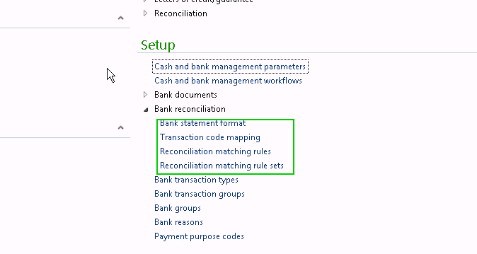 - The first step is to configure the setup required for the electronic bank statement import which includes the parameters, bank statement format, transaction code mapping and bank reconciliation matching rules etc.