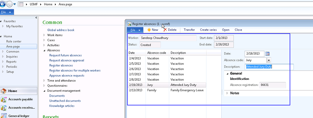 We are now done with all the setups necessary for absence registrations. Let us not take quick look at how employees can register absences. In AX, employees can register absences both in rich client and Enterprise portal.