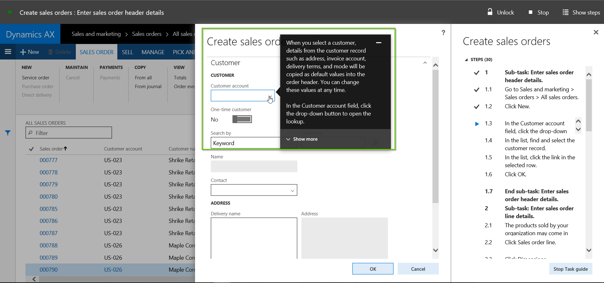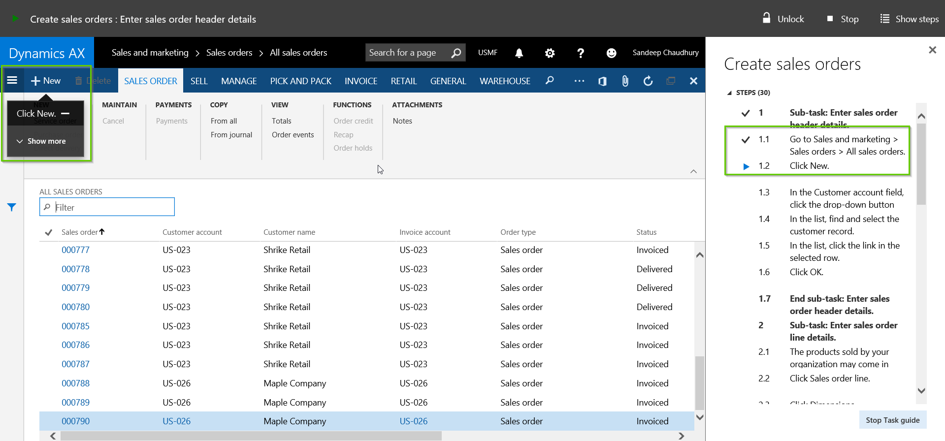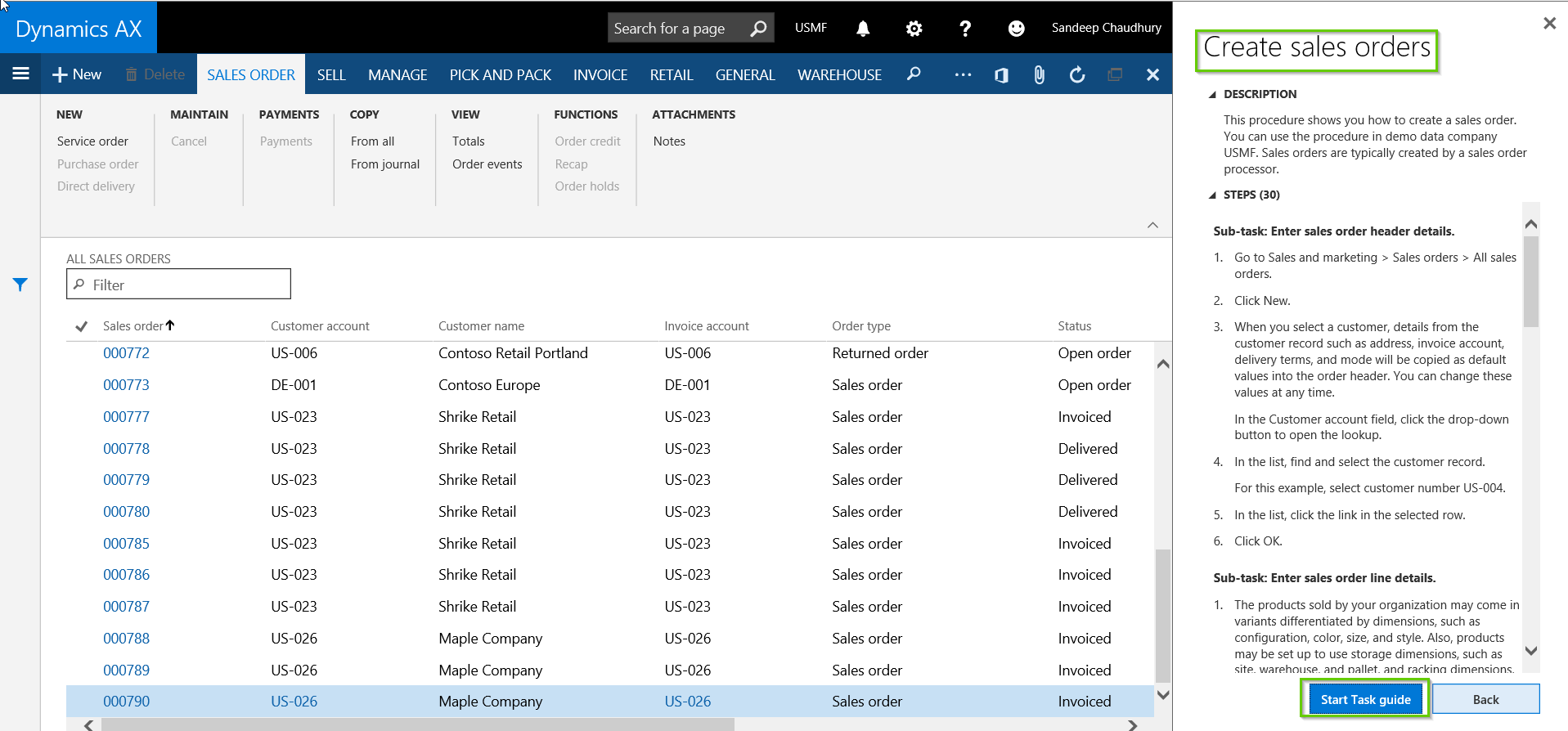 - Once the topics are listed, it is up to the user on how to consume these. If they are a new user dealing with the Sales order process for the first time and they really need step by step guidelines to make sure they do not go wrong, they can Start the Task guide in play mode. This will help them navigate to each click with visual pointers which makes it super easy to follow the steps and execute them.