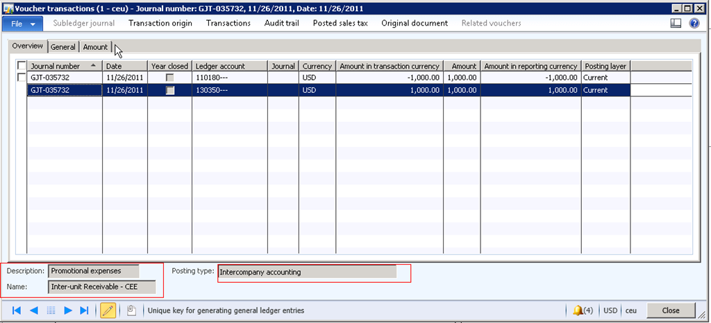 5. Let us now verify the voucher postings. In CEU, navigate to GL > Inquiries > Voucher transactions and fetch the required voucher. Please see the screen below and verify that the petty cash account is credited and the Inter unit receivable – CEE account is debited. ( This is the debit account which we did set in the inter company accounting setup form earlier).
