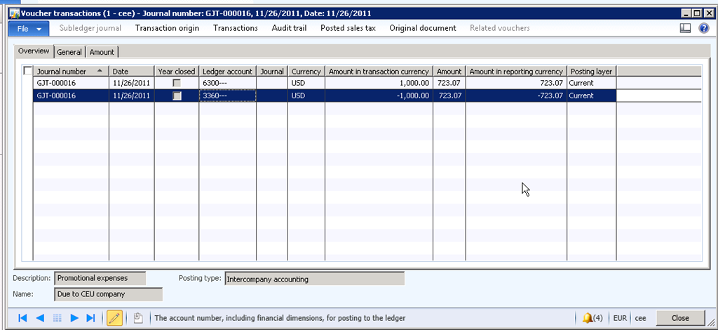 6. Now go to entity CEE and notice the voucher. The Due to CEU account(3360 is the credit account which set in the intercompany accounting setup parameters of CEE entity.