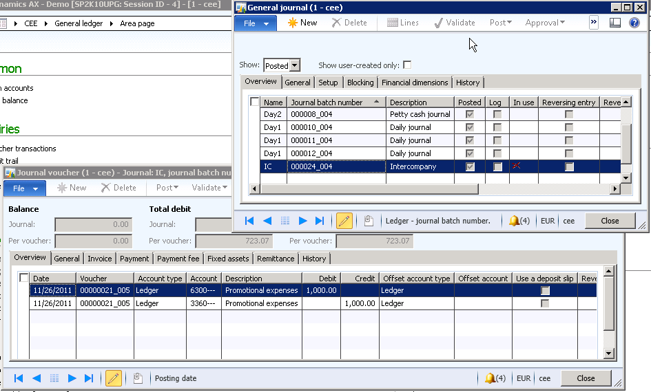 We will do this in the CONTOSO dataset. Let us say that the CEU is the source company and CEE in the destination legal entity and CEE ordered some stationary for promotional events, for which the finance controller of CEU received the invoice. Now the controller needs to post and intercompany entry to record the transaction in CEE.