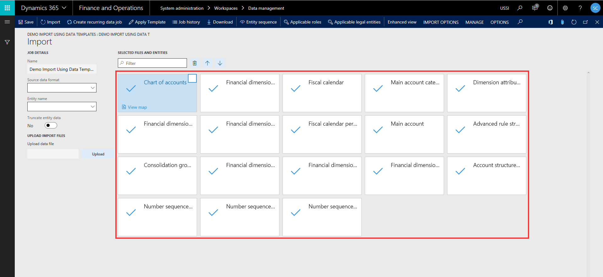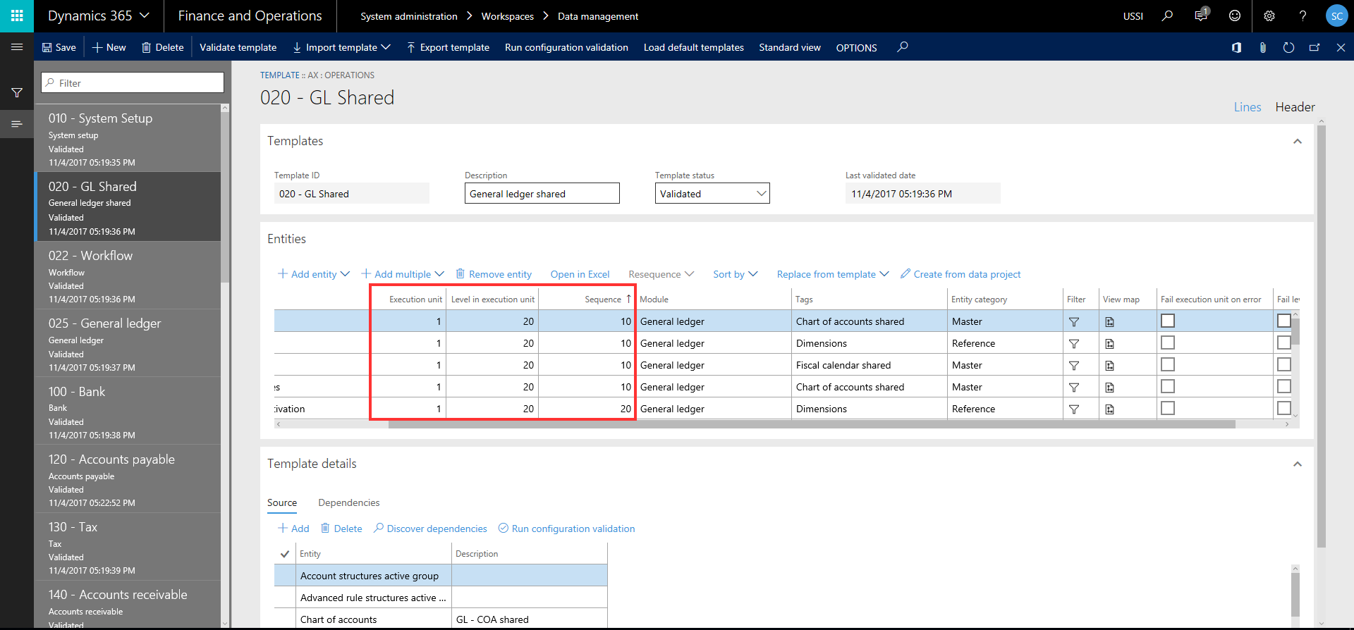 • Notice here that all the data entities that were part of the General Ledger-Shared data template are automatically loaded and all the level and sequencing of these entities is also inherited from the template setup. Now, you can just upload the excel/source data files for all these entities and schedule the data project to run. It will run and automatically process the entities in the correct sequence as per the definition in the template.