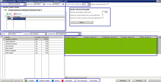 Click the “Reserve worker” button to open the Worker reservations main form.Note that the project manager has several options on this form such as editing the worker competency criteria, search workers by role, by name, department, legal entity.